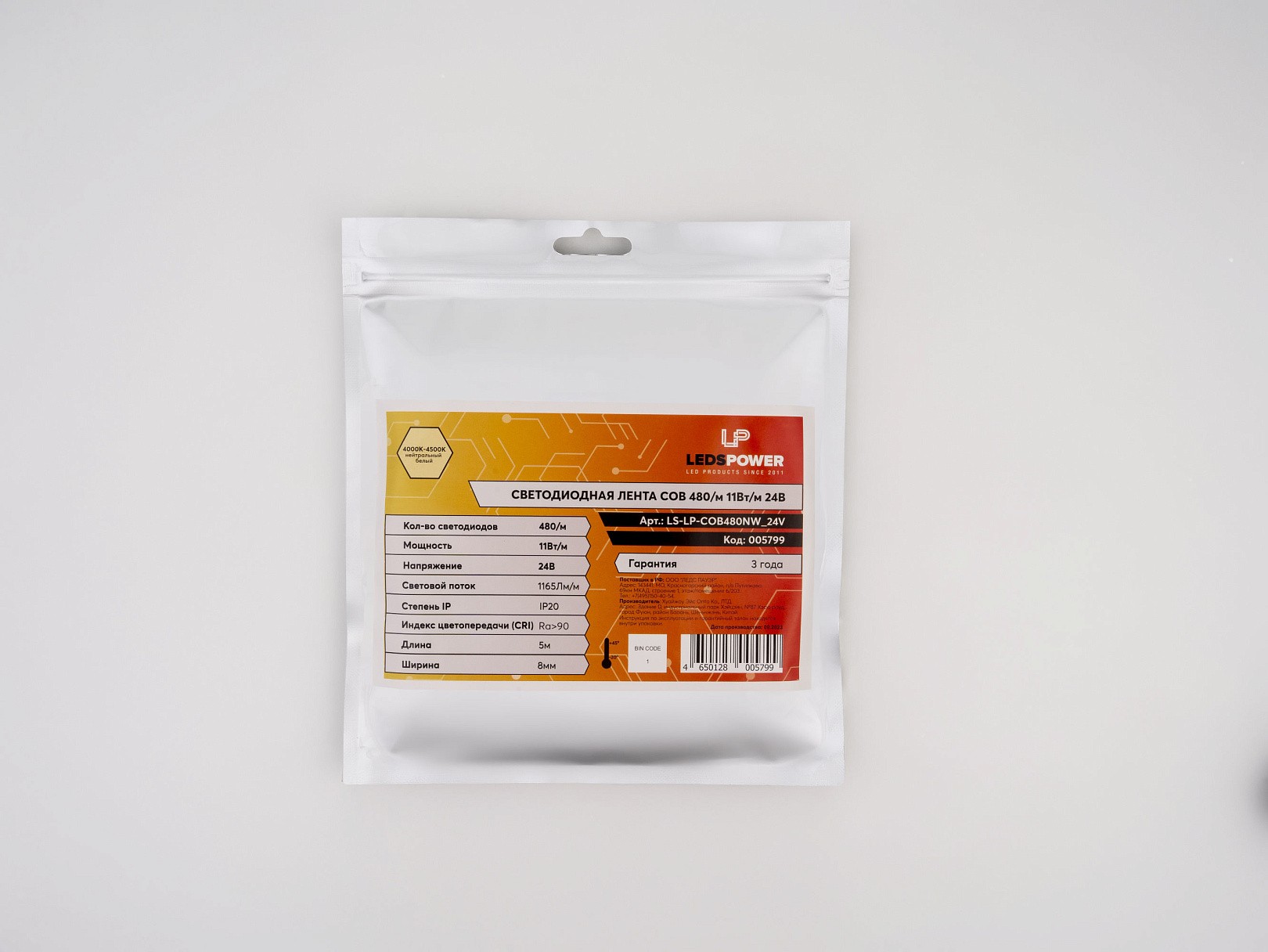 Светодиодная лента LP COB 480/м (11 Вт/м) работает от напряжения 24 В и имеет холодный цвет свечения. Лента состоит из светодиодов типа COB, расположенных на расстоянии 8 мм друг от друга. Общее количество светодиодов составляет 480 штук на 1 метр ленты. Лента имеет степень защиты IP20 и предназначена для использования внутри помещений.