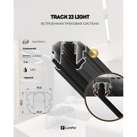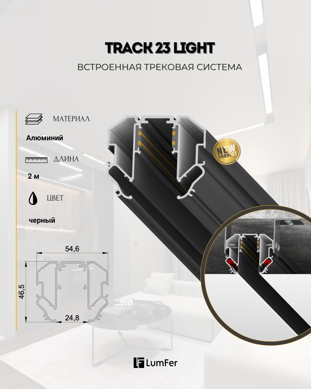 Система освещения Трек 23 Light – это безопасная низковольтная система освещения. В конструкции используется специальный монолитный алюминиевый профиль, в который установлены токопроводящие дорожки, через которые подается электропитание на светильники.