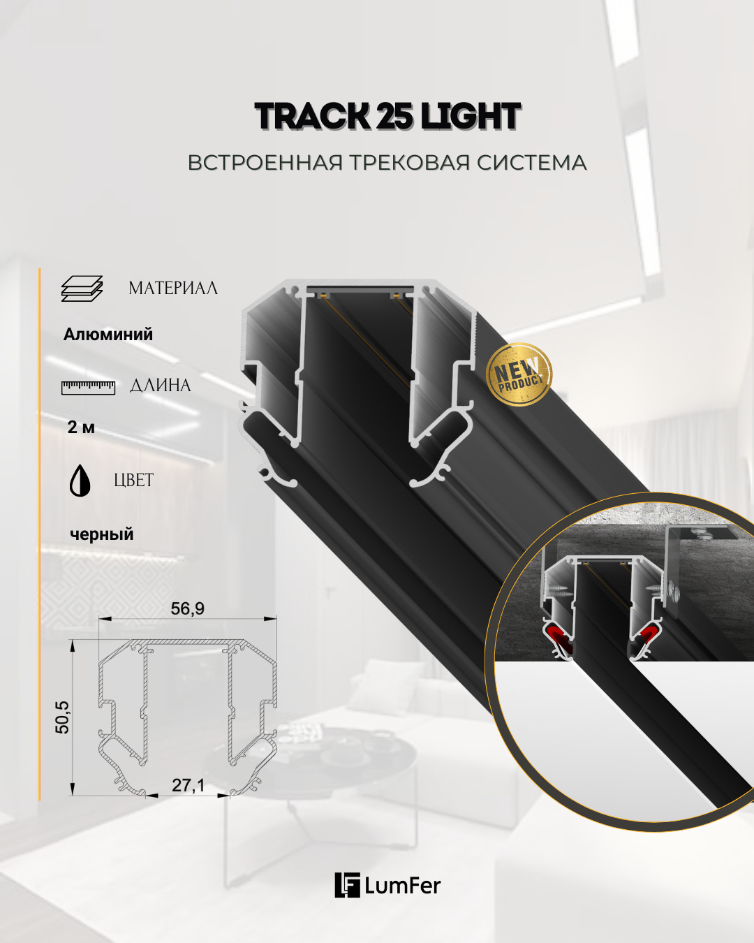 Система освещения Трек 25 Light – В конструкции используется специальный монолитный алюминиевый профиль, в который установлены токопроводящие дорожки, через которые подается электропитание на светильники.