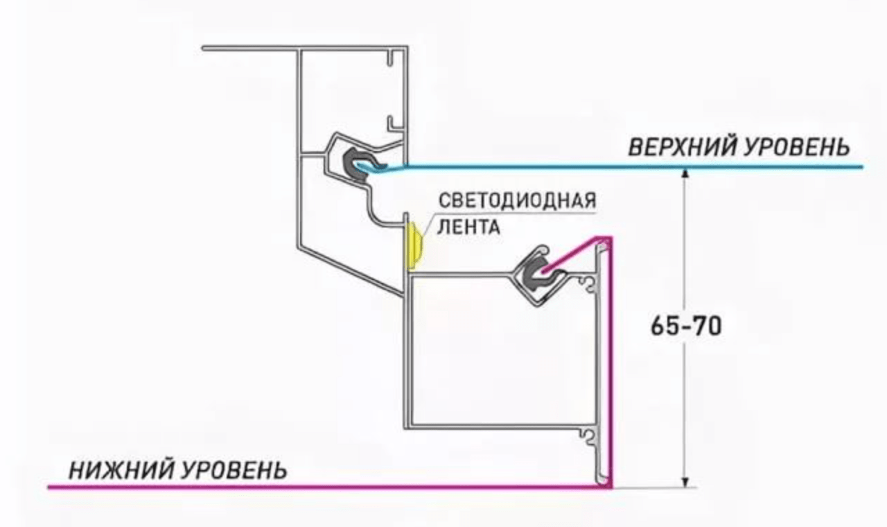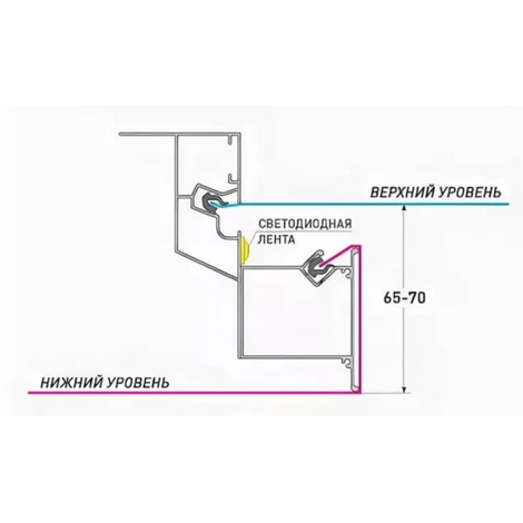 - НП — профиль для ступенчатого перехода с подсветкой (нишевой профиль). Предназначен для изготовления каркасов сложных натяжных потолков гарпунной системы с межуровневой нишевой подсветкой. Модель НП5 обеспечивает ступенчатый переход высотой 50 мм.