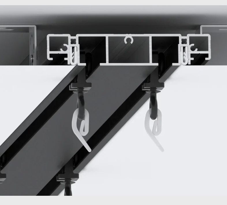 Важная особенность решения – наличие бесшумных прорезиненных бегунков белого или черного цвета. Система комплектуется демпфером для монтажа ПВХ и тканевых полотен.