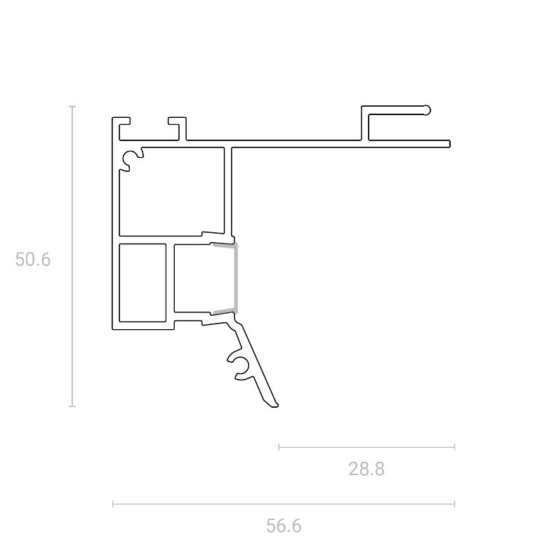 Двусоставной потолочный профиль, монтируемый с каркасом потолка для обеспечения декоративного зазора в 30 мм. Связь со стеной обеспечивается с помощью базового профиля UMBRA через подвижный полимерный элемент.