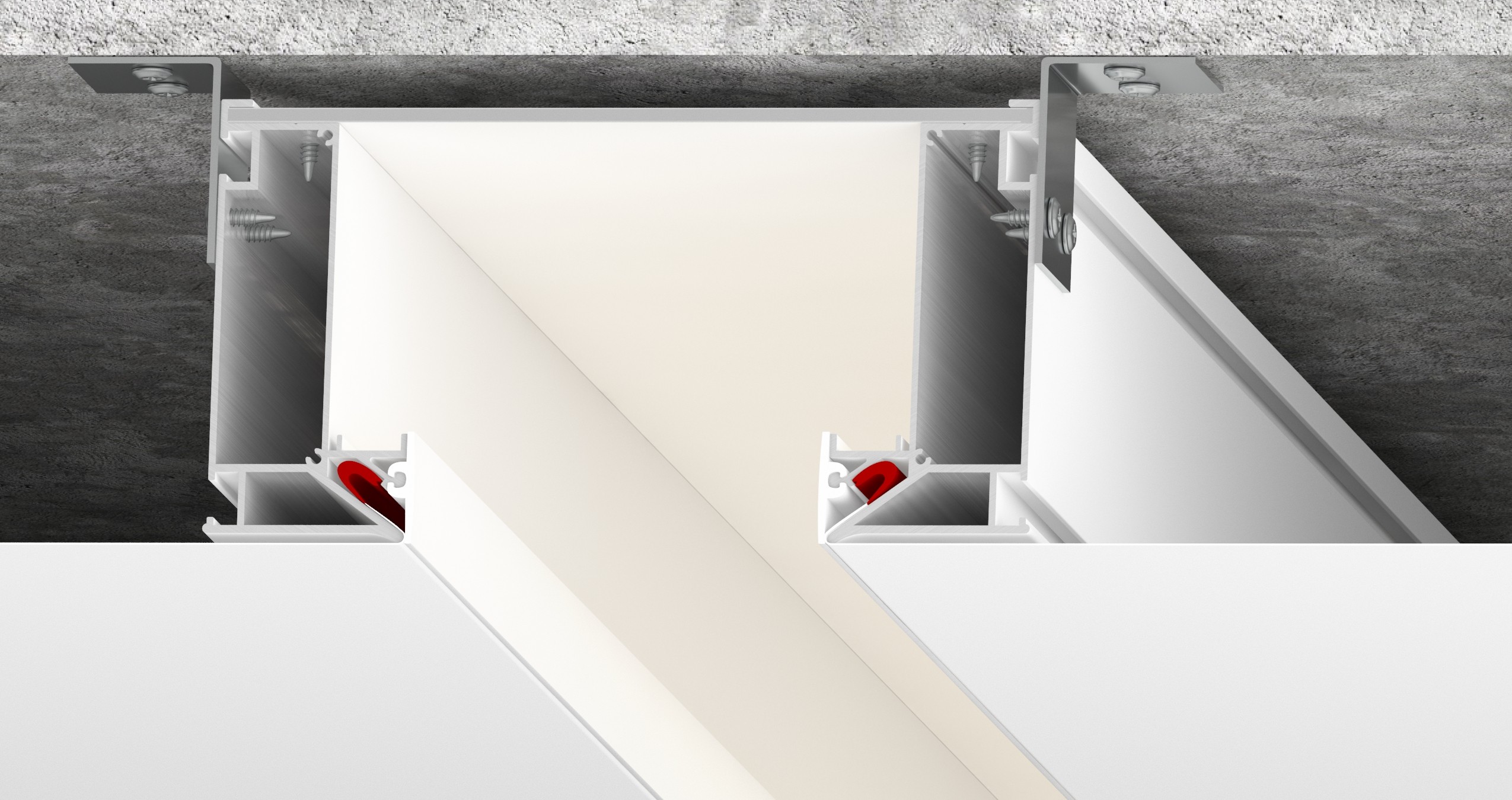 2. Ниша LumFer с рефлекторным освещением – это система освещения, которая в принципе своей работы использует отраженный свет. При изготовлении конструкции ниши применяются алюминиевые профили B01 (Basis), расположенные симметрично друг к другу и композитные листы белого цвета. В специальные пазы с двух сторон профиля устанавливается светодиодная лента. Конструкция профиля предусматривает фиксацию полотна при помощи гарпунной системы крепления. Паз для фиксации гарпуна закрывается маскирующей вставкой ПВХ черного или белого цвета.