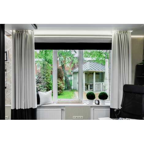 - Модульный карниз – универсальное решение оформления ниши для штор. Карниз представляет собой нишу черного или белого цвета внутри которой расположены два ряда, для крепления крючков оконных занавесок. Возможна установка светодиодной ленты для подсветки штор. Конструкция профиля предусматривает фиксацию полотна при помощи гарпунной системы крепления. Паз для фиксации гарпуна закрывается маскирующей алюминиевой или ПВХ вставкой.
