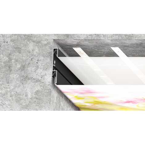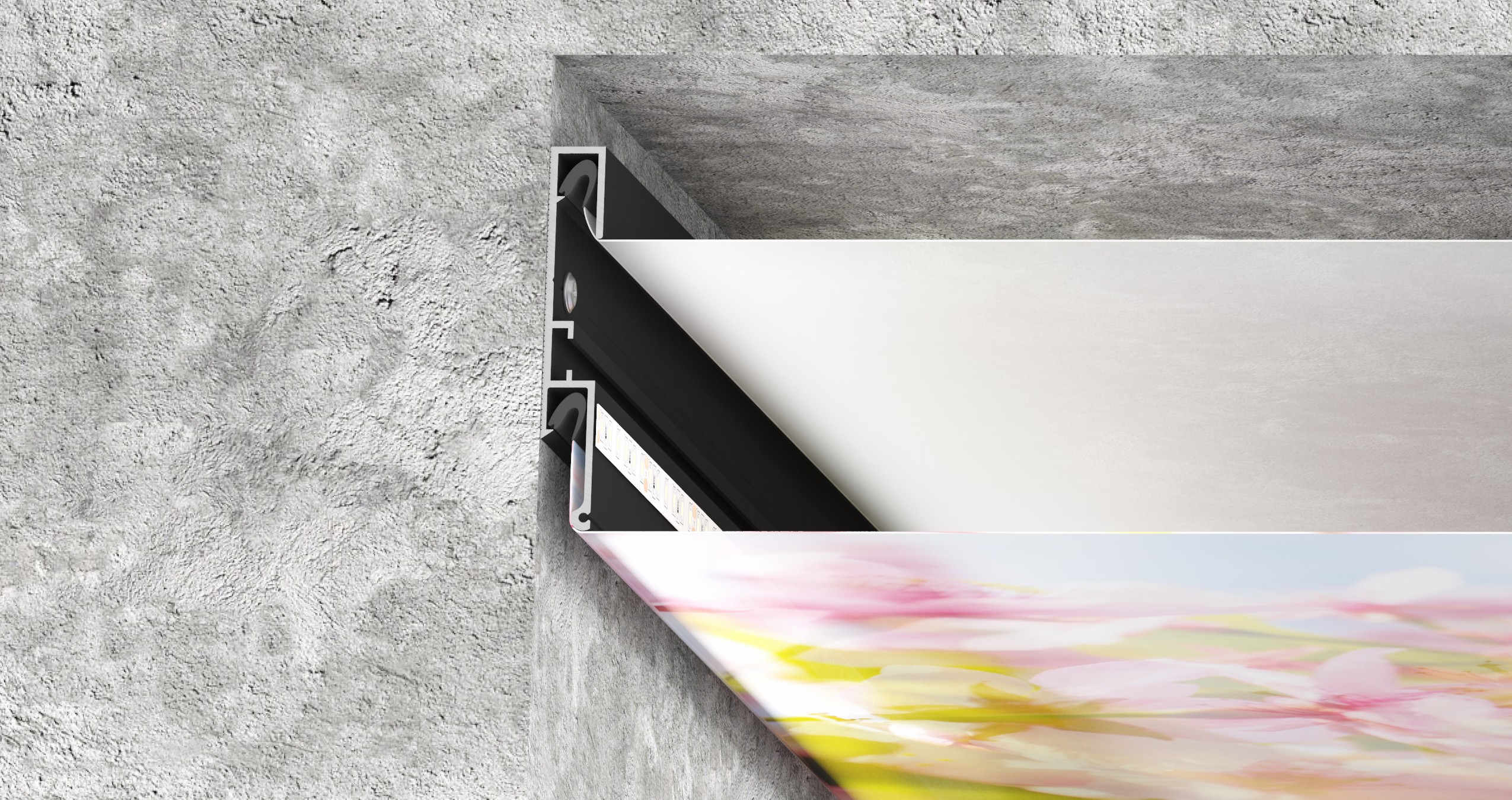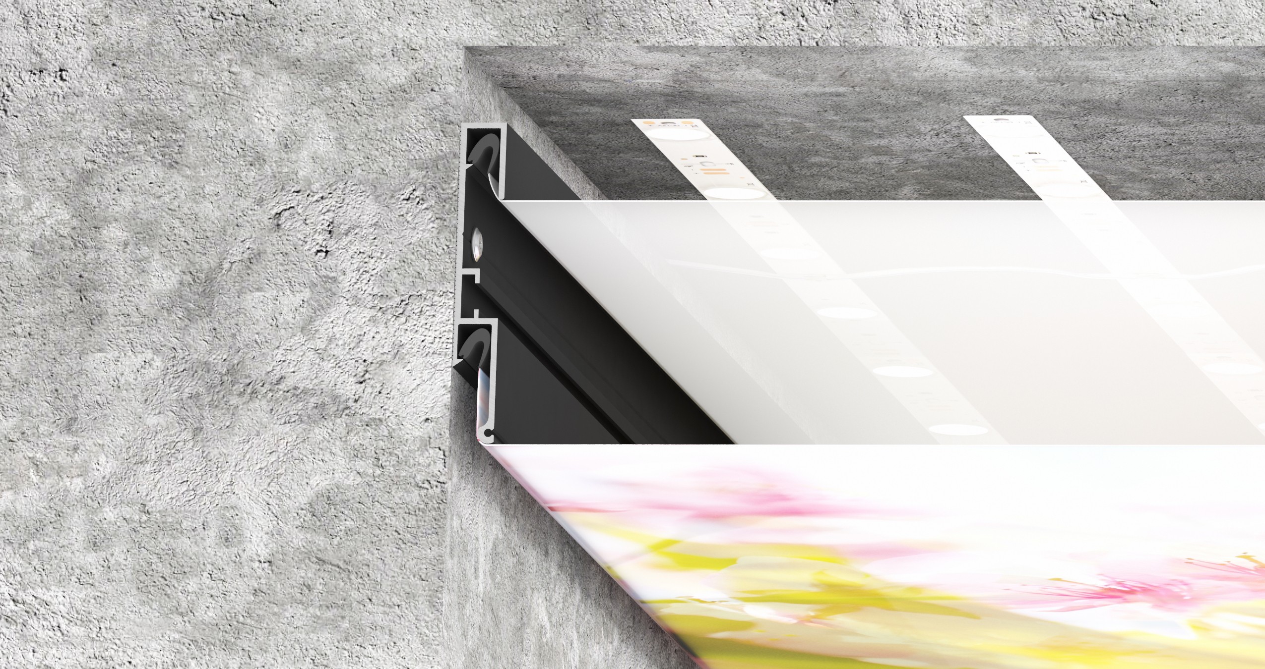Double LumFer (двойной контурный)– специальный монолитный алюминиевый профиль, особенностью которого является возможность устанавливать 2 полотна на разных уровнях. Профиль применяется в арт потолках, резных и Double Vision, крепится по периметру помещения. Визуальная особенность этой конструкции заключается в образовании теневой зоны по периметру помещения шириной 0,6 см. Таким образом профиль обеспечивает идеально ровный темный контур без установки заглушки по периметру потолка.