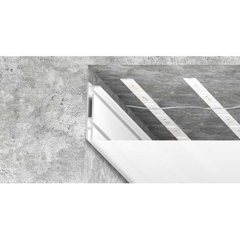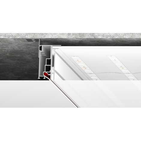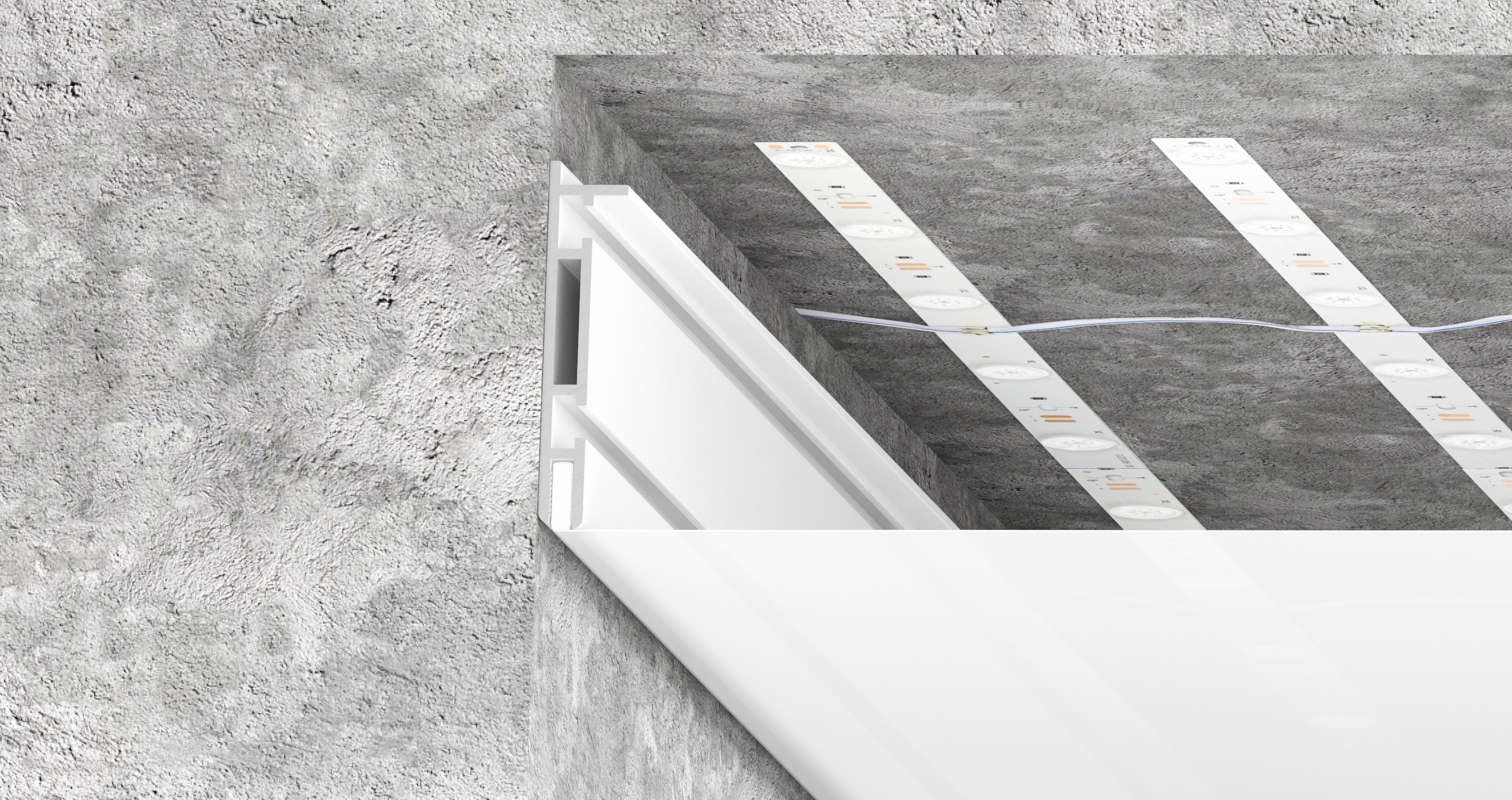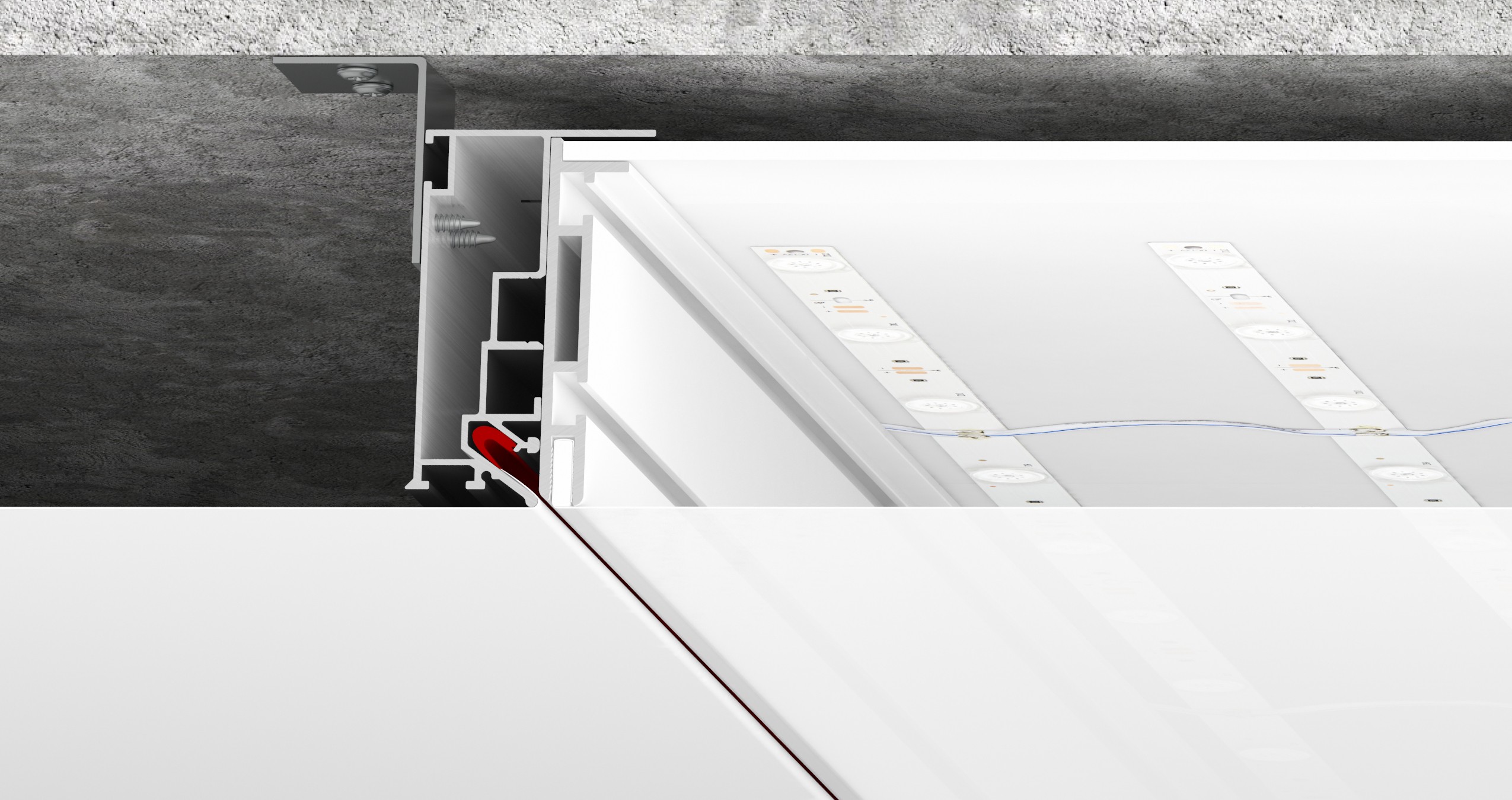 1. Встроенный светильник: профиль применяется совместно с профилем BP01 для изготовления встроенных светильников. Изготавливается короб из профиля BP01, в центральной части которого монтируются светодиодные линейки в качестве источника света. Далее крепится LB01, в который при помощи канта ПВХ монтируется полупрозрачное полотно. Таким образом получается встроенный светильник, полностью интегрированный в натяжной потолок без заглушки и зазоров.