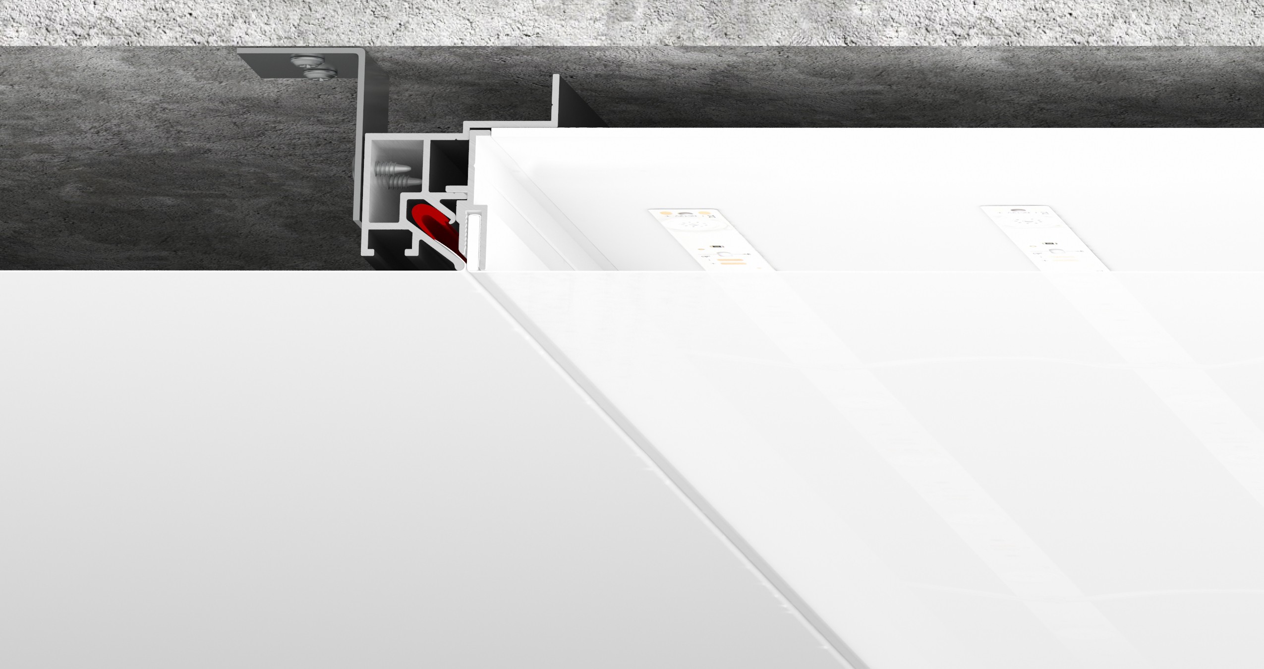 Встроенный светильник: профиль применяется совместно с профилем BP01 (безрамный) для изготовления встроенных светильников. Изготавливается контур из профиля BP01, в центральной части которого монтируются светодиодные линейки в качестве источника света. Далее крепится LB02 mini, в который при помощи специального канта ПВХ монтируется полупрозрачное полотно с изображением или без него. Таким образом получается встроенный светильник, полностью интегрированный в натяжной потолок без заглушки и зазоров.
