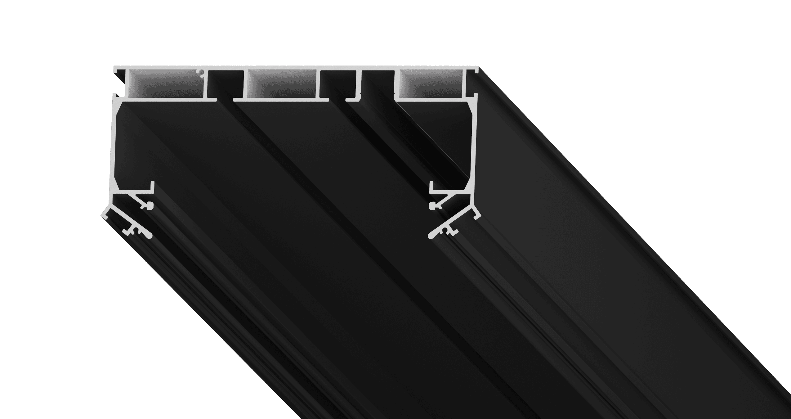 Скрытый карниз SK02: Разновидность дизайнерского карниза. Он представляет собой цельнометаллический профиль белого или черного цвета с двумя рядами для крепления крючков. Обладает увеличенным размером между рядами для крепления штор. Карниз имеет оптимальную ширину, для того чтобы складки на шторах формировались правильно. Возможна установка светодиодной ленты для подсветки штор, которая направлена вертикально вниз и закрывается рассеивателем. Конструкция профиля предусматривает фиксацию полотна при помощи гарпунной системы крепления. Вертикальный паз для фиксации гарпуна закрывается маскирующей вставкой, алюминиевой или ПВХ.