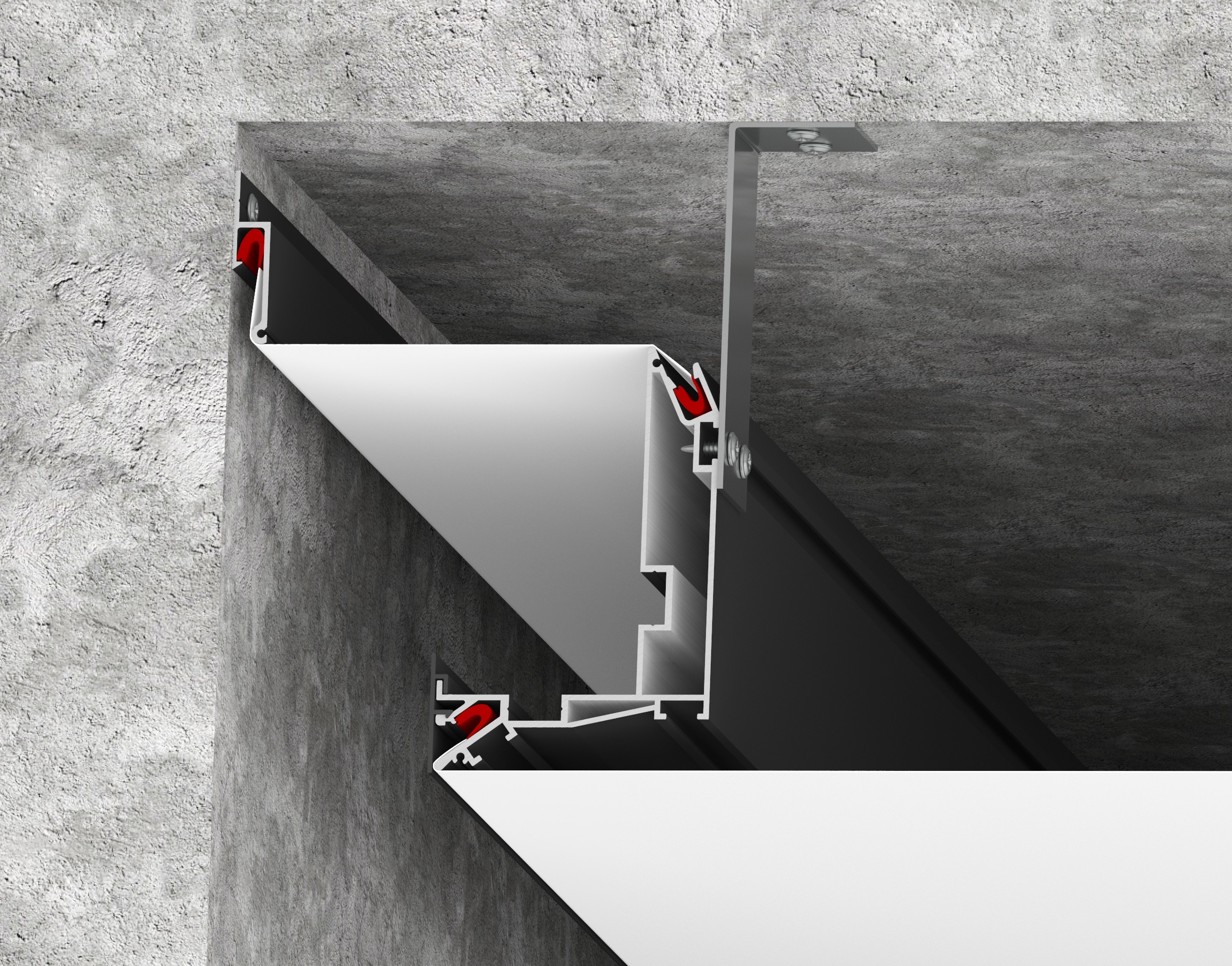 При помощи профиля LumFer UN можно реализовывать переход уровня в помещении как с подсветкой, так и без нее. Для данного вида конструкции рекомендуется использовать полотна LumFer для предотвращения засветок за полотно. Профиль крепится к потолку при помощи анкерных уголков.