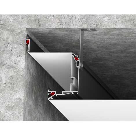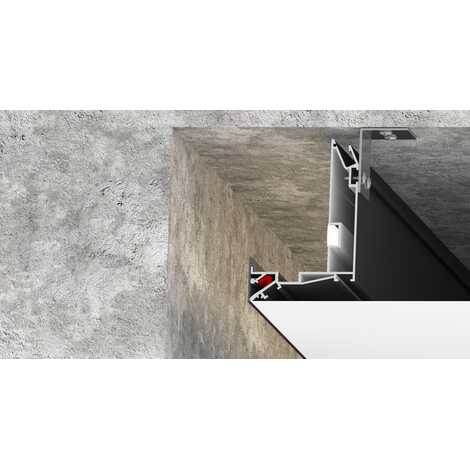 - Универсальная интерьерная ниша – это специальный алюминиевый профиль, предназначенный для изготовления ниши по периметру помещения. Нишу возможно изготавливать любой ширины вдоль всех стен либо вдоль отдельных стен в помещении. Профиль, окрашенный в белый или черный цвет, имеет пазы для установки подсветки, таким образом мы имеем возможность организовать интерьерную подсветку. Подсветка в профиль устанавливается двумя вариантами: направленная вверх либо в сторону стены, для равномерного освещения светодиодная лента закрывается светорассеивающим экраном (ПВХ). Конструкция профиля предусматривает фиксацию полотна при помощи гарпунной системы крепления. Паз для фиксации гарпуна закрывается алюминиевой или ПВХ вставкой. Профиль крепится к потолку при помощи анкерных уголков.