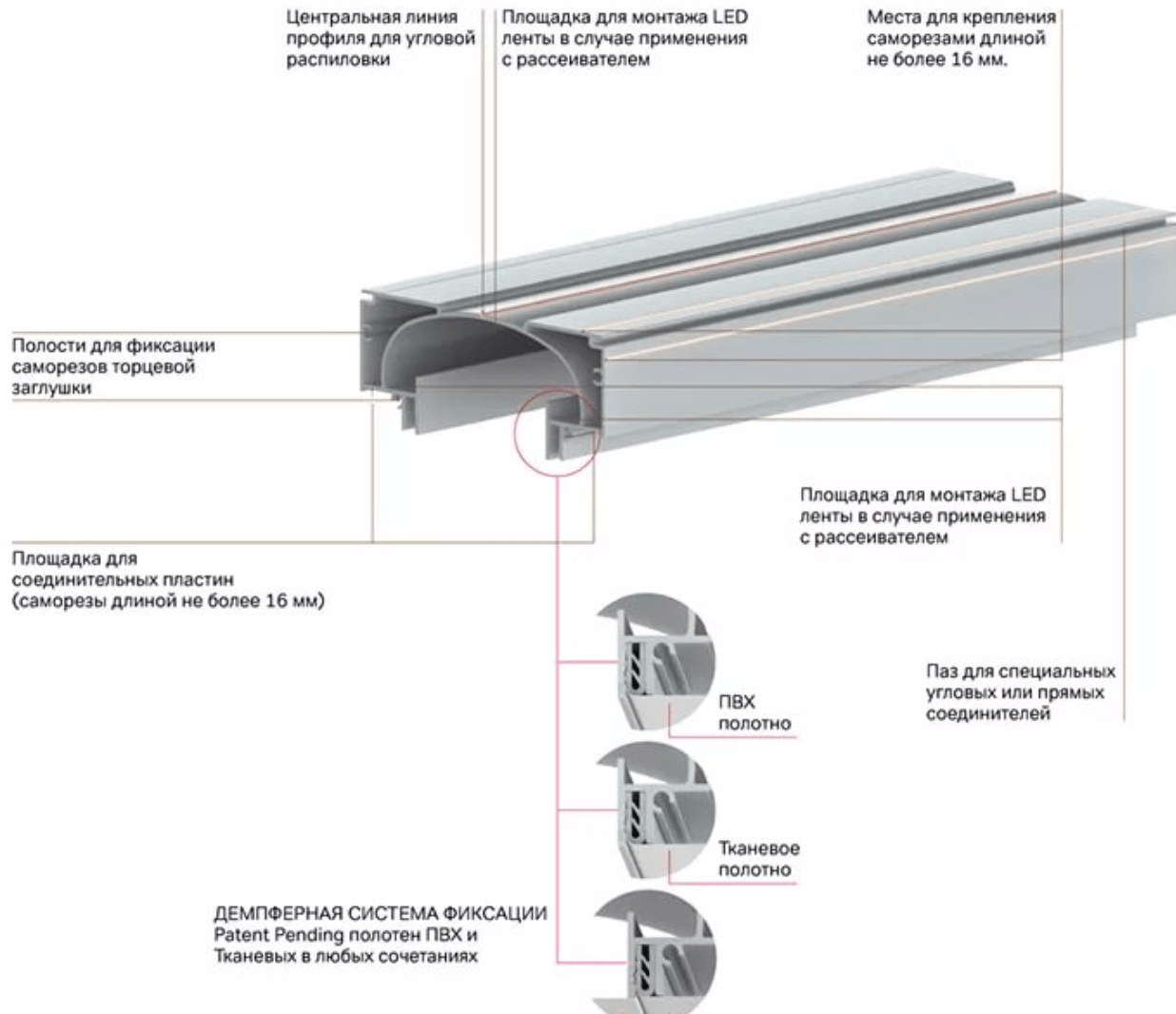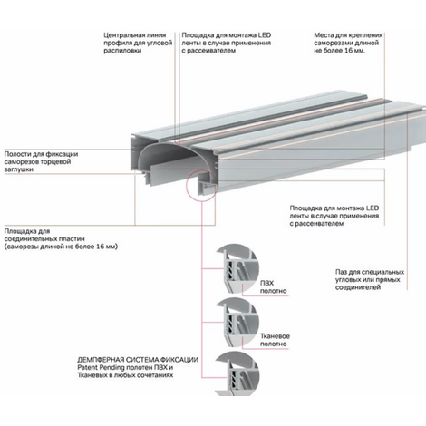 Система допустима к монтажу как в открытом виде, так и с рассеивателем в виде полупрозрачного полотна. Выпускается в трёх цветовых решениях: чёрно-белый и белый вариант под продольную засветку, а также чёрный вариант для установки дополнительных светильников.