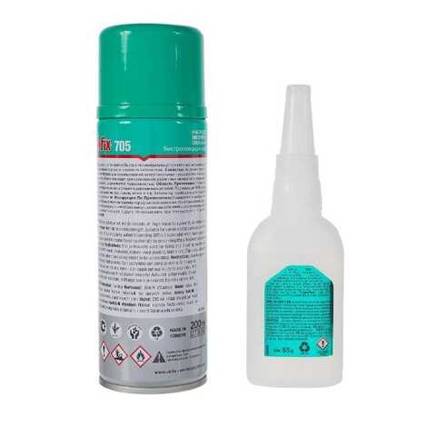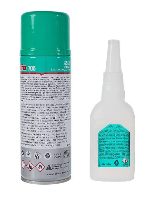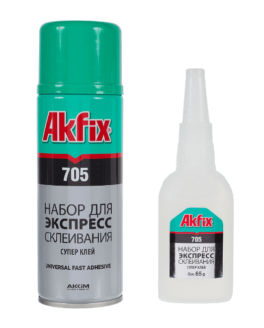 AKFIX 705 – двухкомпонентный клей, который состоит из вязкого геля цианоакрилата и аэрозоля активатора.